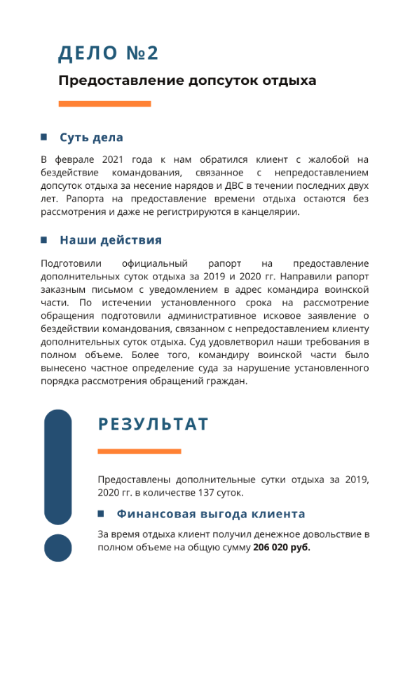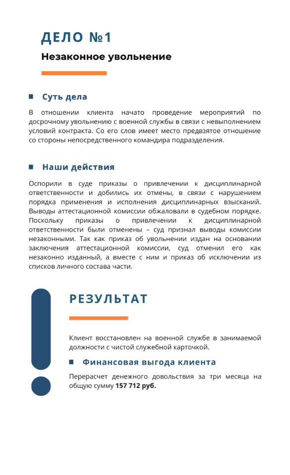Отменим незаконные приказы об увольнении, назначении, переводе к новому месту службы. Добьемся предоставления отпусков и допсуток отдыха. Поможем реализовать свои права при увольнении.