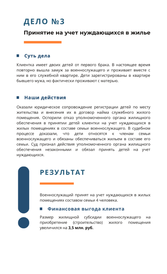 Наши специалисты имеют многолетний стаж работы и службы в Вооруженных Силах РФ, жилищных и надзорных органах. Знаем всё о порядке прохождения военной службы, жилищном и социальном обеспечении военнослужащих и членов их семей.